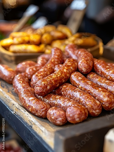 Close-up of a pile of delicious grilled sausages on a rustic wooden board.