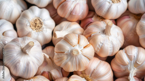 Close-up of a pile of fresh garlic bulbs, showcasing the texture and natural patterns of the garlic on a market display