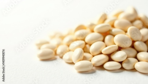 Close-up of a pile of white beans against a bright white backdrop, simple food, texture, isolated beans
