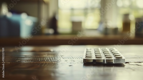Close-up of a pill organizer on a wooden table with medical supplies, representing daily medication management for chronic illness and health care routines
