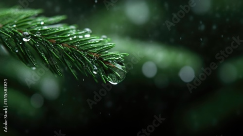 Close-up of a pine branch with water droplets