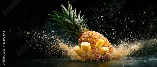 Close-up of a pineapple with its leaves still attached. the pineapple is in the center of the image, with the top half of the pineapple facing towards the right side of the frame.