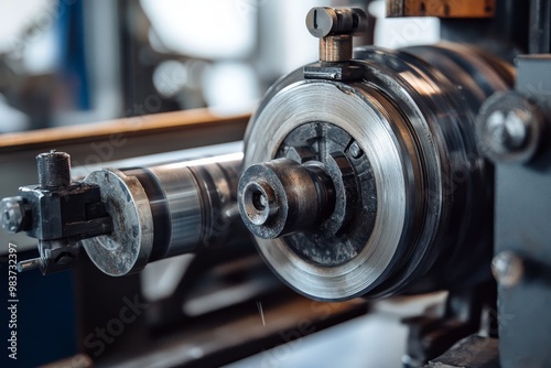 Close-up of a planer machine in a factory setting, showcasing the intricate gears, shafts, and mechanisms used for precision metalworking.