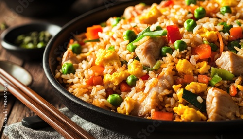 Close-up of a plate of fried rice with chicken, peas, carrots, and bell peppers.