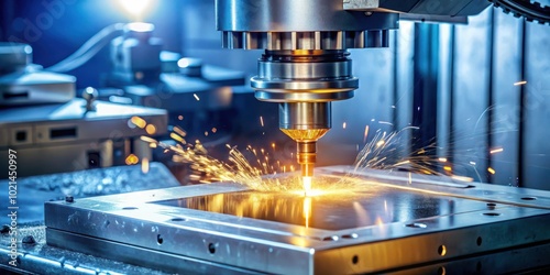 Close-up of a powerful metalworking machine drilling a hole into a metal sheet, creating a shower of bright sparks, demonstrating the precision and power of industrial manufacturing