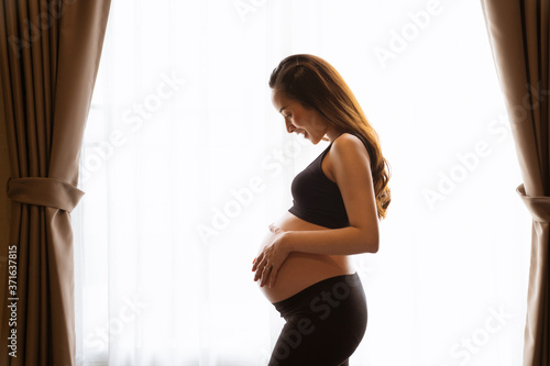Close-up of a pregnant woman touching her belly on the foreground in emotional smile happy by asian woman
