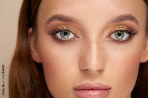 close-up of a pretty girl's face with beautiful big blue eyes, big lashes and eyebrows