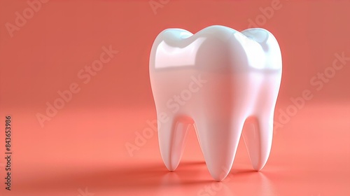 Close-up of a pristine, glossy white tooth model set against a soft coral background.