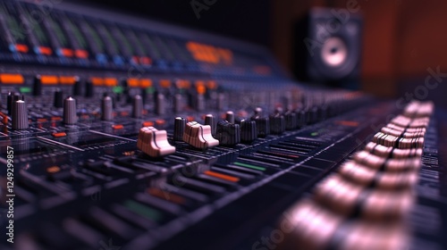Close-up of a professional audio mixing console with vibrant sliders and knobs in use