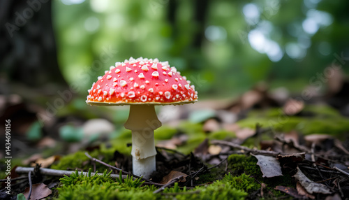 Close-up of a red Fly Agaric mushroom in a natural woodland setting with blurred green background