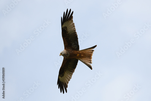 Closeup of a red kite flying high up in a blue sky with their wings wide open