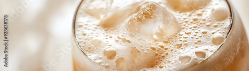 Close-up of a refreshing iced coffee with ice cubes, frothy texture, and a delicious creamy blend, perfect for a summer drink.
