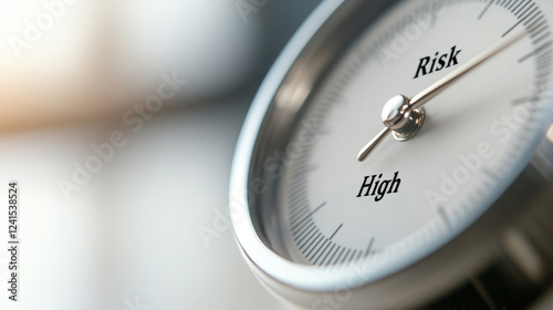 Close-up of a risk score indicator pointing to high on a dial gauge, measuring dangerous levels, with soft light and a plain white background, symbolizing risk assessment and management