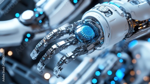 Close-up of a robotic hand, metallic with glowing blue core. Illustrates advanced technology, robotics, AI.