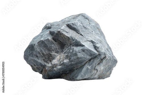 Close-up of a rough, gray rock with a textured surface, isolated on white.
