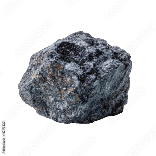 Close-up of a rough, irregular stone. Dark gray and muted blue hues. Intricate, mottled patterns