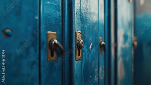 Close-up of a row of blue lockers with brass hardware. Aged paint, metal handles, and latches are visible