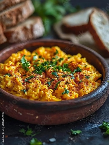 Close-up of a rustic bowl of vibrant yellow scrambled eggs, garnished with fresh parsley and paprika, served alongside slices of crusty bread.