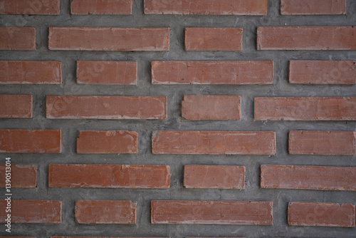 Close-up of a rustic red brick wall with textured mortar, showcasing a classic construction pattern