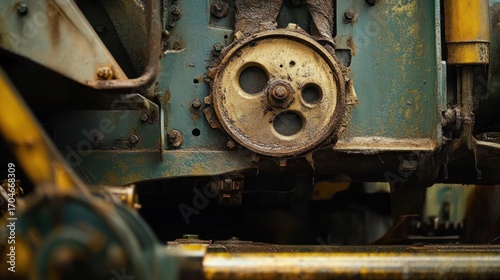 Close-up of a rusty industrial gear and mechanical parts on old machinery with worn green paint and yellow accents