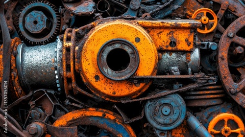 Close-up of a rusty mechanical engine with vibrant orange and blue details