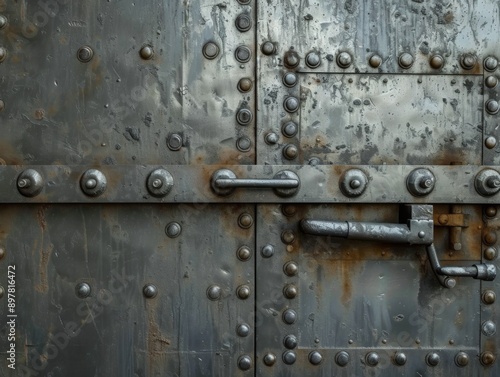 Close-up of a rusty metal door with rivets and a latch. The metal has a worn, industrial look.