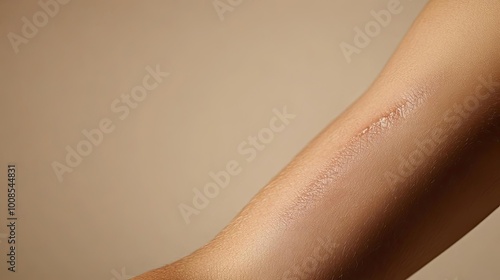 Close-up of a scar on a human arm, showcasing textured skin and healing process against a neutral background.