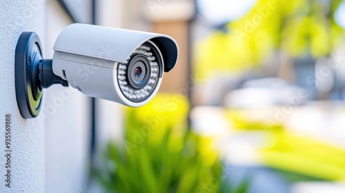 Close-up of a security camera mounted on a wall, capturing outdoor surroundings for enhanced surveillance and safety.