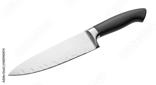 Closeup of a sharp stainless steel chefs knife.