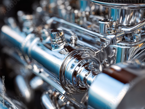 Close-up of a shiny chrome engine component emphasizing craftsmanship and precision.