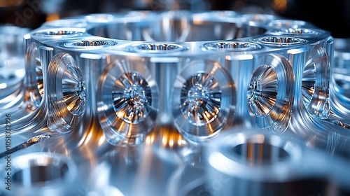 Close-up of a shiny metal ring with multiple small, polished holes and a blurry background.