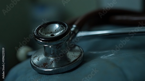 Close-up of a silver stethoscope on a blue surface, highlighting its metallic details.