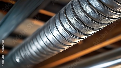 Close-up of a silver-colored heating plastic plumber's pipe on a wooden ceiling in a house
