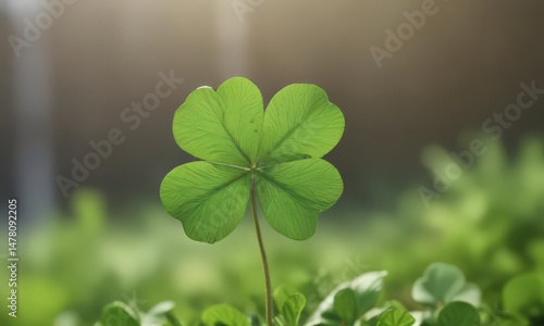 Close-up of a single, bright green four-leaf clover against a blurred background , botanical, nature, garden
