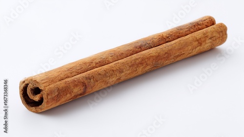 Close-up of a single cinnamon stick on a plain white background