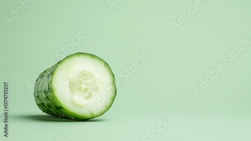 Close-up of a single cucumber slice on a light green background. the cucumber is cut in half, revealing the white flesh inside. the flesh appears to be fresh and has a slightly wrinkled texture.