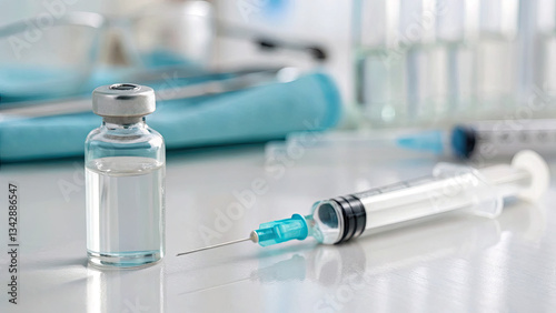 Close-up of a single measles vaccine vial on a clean, sterile surface with medical equipment in the background. Healthcare, immunization, and medical research concepts.