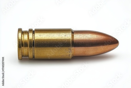 Close-up of a single metallic bullet cartridge with a brass casing and copper-colored pointed tip on a white background