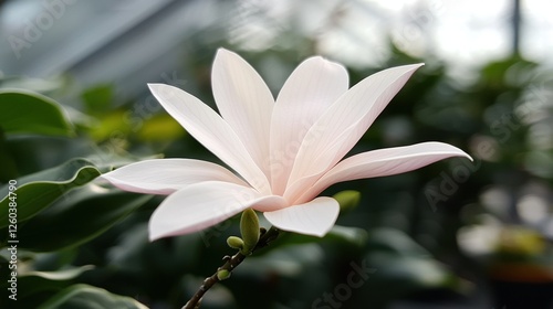 Close-up of a single pink flower bud on a tree branch. the flower has five petals that are arranged in a fan-like pattern, with each petal slightly overlapping the one below it.