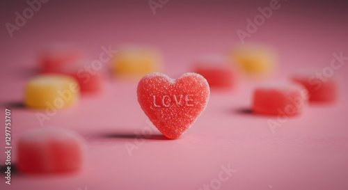 Close-up of a single red heart-shaped gummy candy with "LOVE" imprinted, surrounded by blurred yellow and red hearts on a pink background