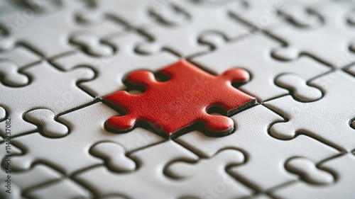 Close-up of a single red puzzle piece fitting into white puzzle pieces