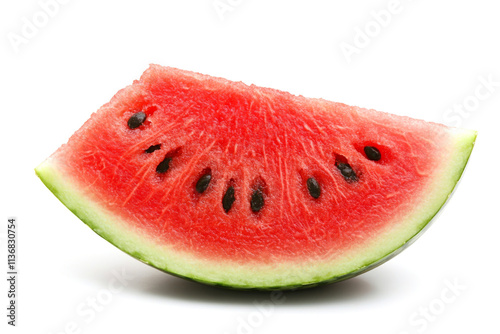 Close-up of a single watermelon slice revealing its vibrant red pulp, black seeds, and green rind against a clean white backdrop