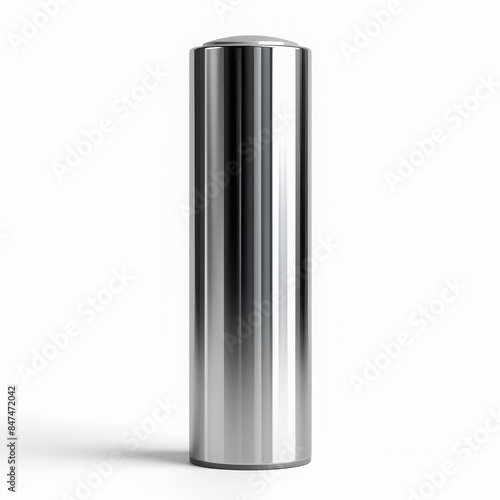 Close-up of a sleek, shiny metallic cylinder with a reflective surface against a white background. Ideal for industrial or design themes.