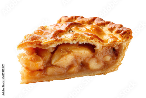 Close-up of a slice of apple pie. Golden brown flaky crust, juicy apple filling