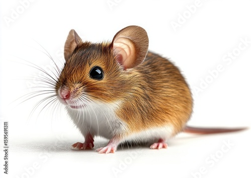 close-up of a small, brown and white mouse with large ears and whiskers standing on a white surface looking curious