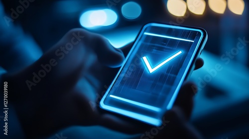 Close-up of a smartphone with blue check mark signifying task completion in a digital environment : Generative AI
