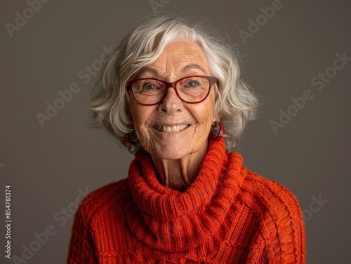 Close-up of a smiling elderly woman, wearing a bright sweater, with a plain backdrop