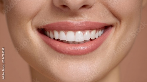 Close-up of a Smiling Woman with Healthy Teeth and Radiant Skin Against a Soft Background