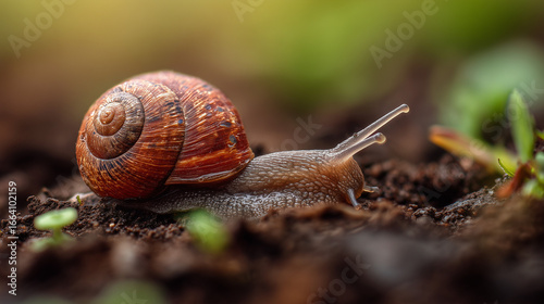 Close-up of a snail crawling slowly on natural ground in a lush outdoor environment, soft sunlight gently shining down, vibrant and lively atmosphere.