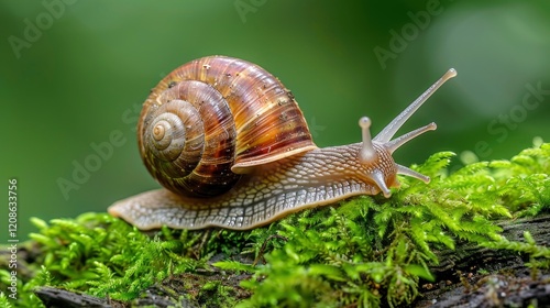 Close-up of a snail on a moss-covered log in a lush green forest, showcasing nature's beauty